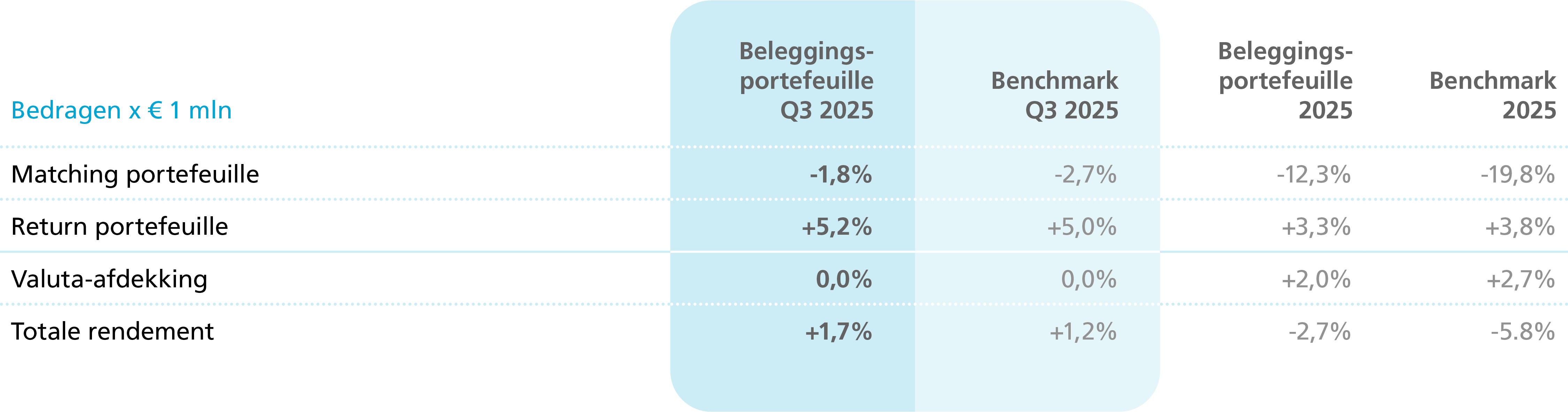In het derde kwartaal was het rendement op de return portefeuille positief. Alle beleggingscategorieën droegen bij aan het resultaat, met name aandelen, vastgoed en high yield obligaties.