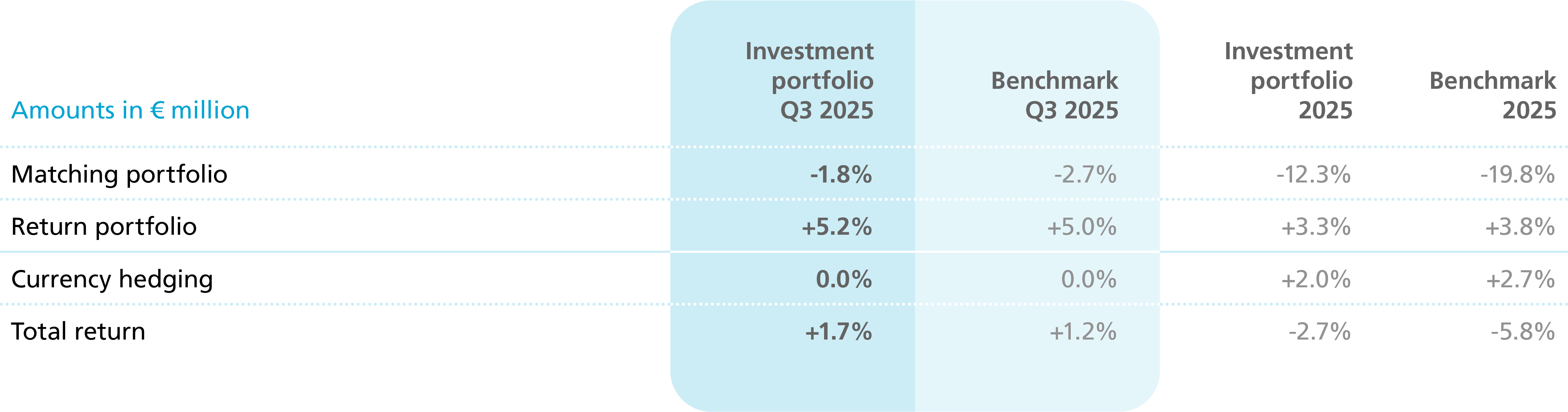 Performance of the overall matching portfolio was negative in the third quarter. This portfolio invests in European sovereign bonds, bonds issued by semi-government institutions, covered bonds and residential mortgages in the Netherlands. The portfolio also contains interest rate swaps and repos (short-term loans covered by collateral). An important factor impacting the value development of the matching portfolio is the development of market interest rates. When interest rates rise, bonds decrease in value.